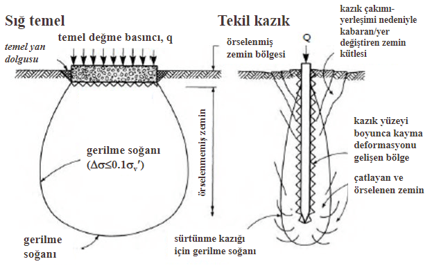 - Yapım tekniği açısından sığ ve kazıklı temel arasındaki en önemli fark imalat sırasında zeminde meydana gelen örselenmenin sığ temelde yüzeye yakın kısıtlı bir bölgeyi etkilemesi, kazıkta ise zemin özelliklerindeki değişimin kazık derinliği boyunca ortaya çıkmasıdır.