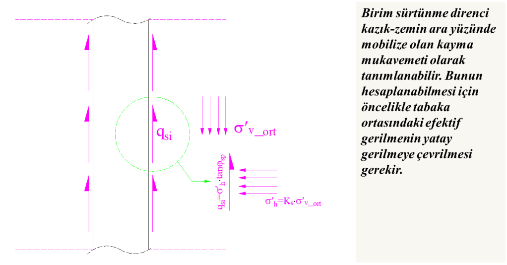 Tabaka içindeki ortalama efektif düşey gerilme ise üstte yer alan tabakaların birim hacim ağırlığı ile yeraltı su seviyesine (YASS) bağlıdır. Kazık-zemin arasındaki sürtünme açısını kazığın imal edildiği malzeme ve zemin türü belirler.