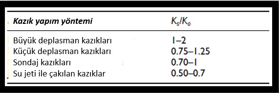 Yanal zemin basıncı katsayısı kazık yapım yöntemine ve zeminin başlangıç sıkılığı ile türüne bağlıdır.