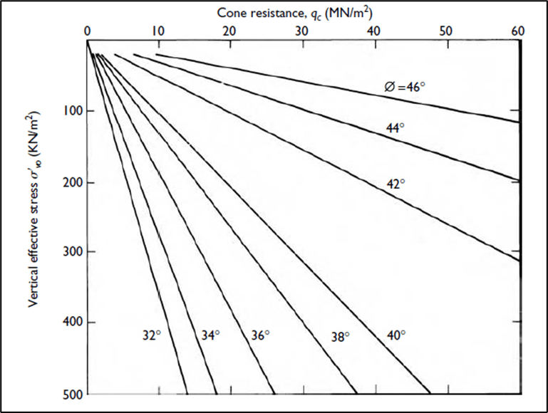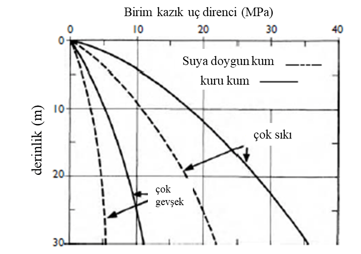 Tamamen üniform kum zeminlerdeki kazıklar için D=Lkazık alınır. Bu grafik çakma, çakma-yerinde dökme ve sondaj kazıkları için kullanılabilir. Ancak sondaj kazıklarında tabanda enjeksiyon yapılmadıkça içsel sürtünme açısı düşük değerlerinde (25°~30°) seçilmelidir (<30° önerilir).