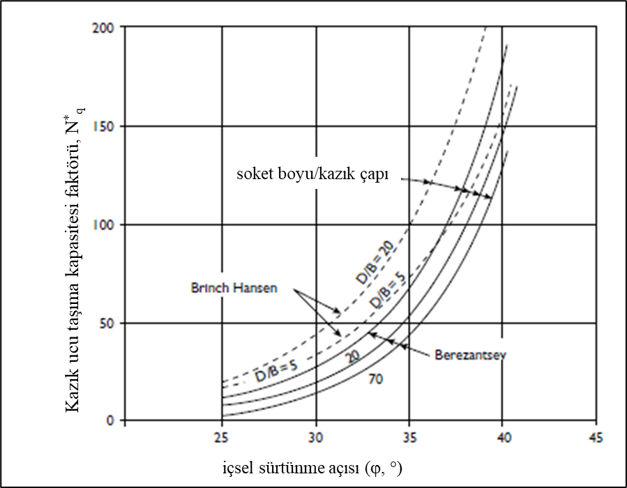 Taşıma kapasitesi faktörü, N*q, Berezantsev veya Brinch-Hansen eğrileri kullanılarak seçilebilir. Brinch-Hansen yaklaşımı Amerikan Petrol Enstitüsü (API) tarafından tercih edilmektedir ve büyük çaplı çakma kazıklarda kullanım için daha elverişli gözükmektedir.