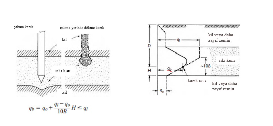 Kazığın soketlendiği (uç direncinin tam anlamıyla mobilize olabilmesi için 5B soketlenme gerekir) kum tabakası yeteri kadar kalın değilse, bir başka deyişle kazık ucuna yakın bir kil tabakası mevcutsa uç direncinde azaltmaya gidilir. Bu azaltma Meyerhof’un önerdiği şekliyle doğrusal enterpolasyon tarzında olabilir ve izleyen slaytta verilmiştir.