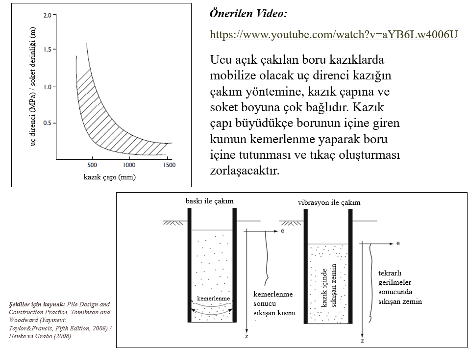 Uç direnci konusunda dikkate alınması gereken bir diğer durum ise ucu açık çakılan boru kazıklardır. Bu tür kazıklar en çok kıyı yapılarında kullanım alanı bulur. Bu tür bir kazık kum zemine soketlendiği takdirde kazık çapına ve kazığın kum içindeki soket boyuna bağlı olarak uç direnci izleyen şekilden okunabilir.
