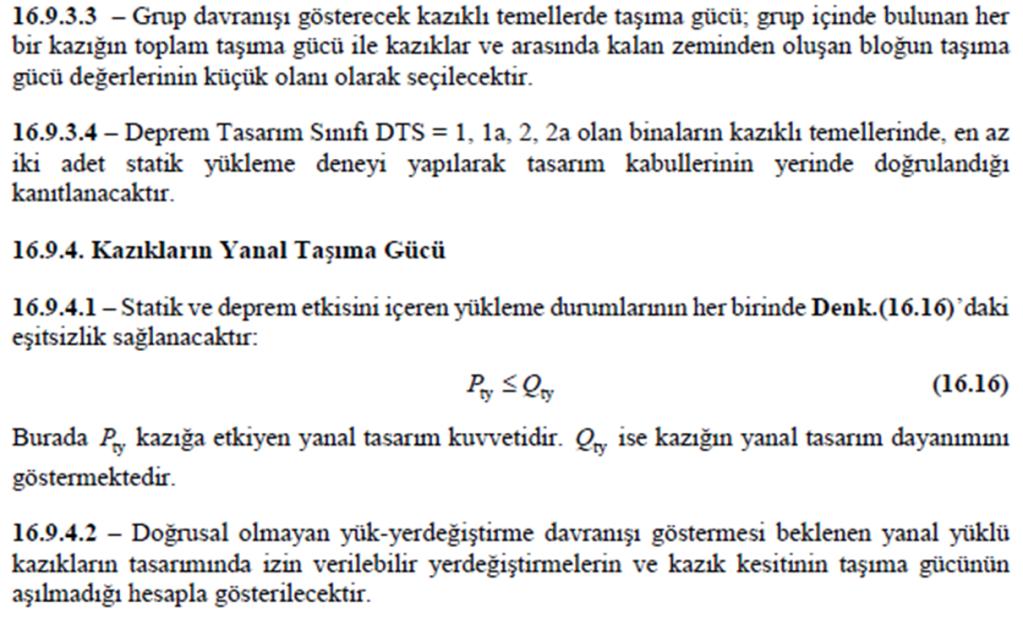 TBDY 2018 Bölüm 16’da kazık tasarımı yapılırken takip edilmesi gereken esasları tanımlanmıştır. Buna göre mühendisin öncelikle tasarım kuvvetini (Ptv) belirlemesi, daha sonra kazık tasarım dayanımını (Qtv) bulması ve bunları birbiriyle kıyaslaması gereklidir. Aşağıda yönetmelikten alıntılar yapılarak bu yaklaşım açıklanmaya çalışılmıştır:
