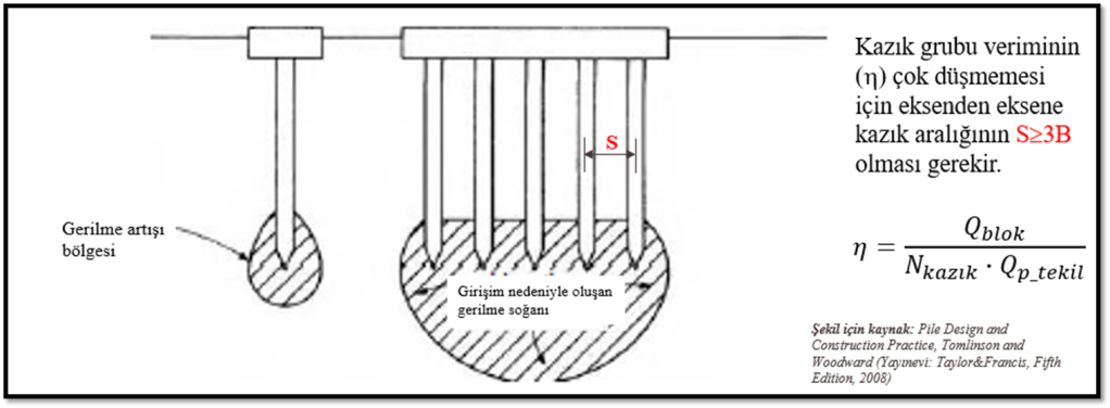 Temel elemanı olarak kazıklar nadiren tekil kullanılır. Bir kısım rüzgar türbin temelleri dışında temel seviyesindeki kuvvet çiftleri kazık grupları oluşturularak taşınır. Bir kazık grubunda stabilitenin eşlenik olarak sağlanabilmesi isteniyorsa minimum üç kazık bulunmalıdır. Bir kazık grubunda yerleşik planda üniform ve eksenden eksene kazık aralığı eşit olabileceği gibi üst yapı taşıyıcı sistemine bağlı olarak farklı dispozisyonlar da mümkün olabilir. Tekil ve grup kazık davranışı arasındaki en önemli fark kazık aralığına bağlı olarak grup içindeki kazıklar arasında girişim meydana gelmesi ve buna bağlı olarak temelin taşıma kapasitesi ve oturma davranışının değişmesidir. Kazık aralığı düştükçe girişim etkisi artar, çok daha derin ve büyük bir zemin kütlesinde gerilme artışı meydana gelir.