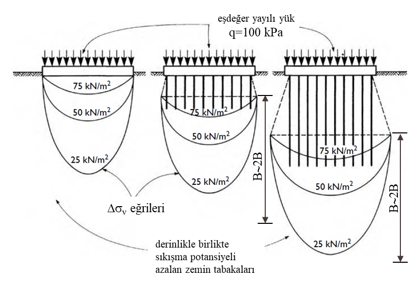 Aşağıdaki şekilde bir yüzeysel temel ve birisi kısa diğeri uzun kazıklar ihtiva eden iki ayrı temel sisteminden kaynaklanan gerilme dağılımları görülmektedir. Her biri eşit yayılı yük taşıyan üç temelden kazıklı olanlar kazık boyuna bağlı olarak yükü derindeki daha rijit tabakalara aktarmakta, bu sayede toplam oturma miktarını düşürmektedir. Ancak dikkatli olunmazsa kazıklı temellerde sığ temeller için görülen oturma problemleri yaşanabilir.