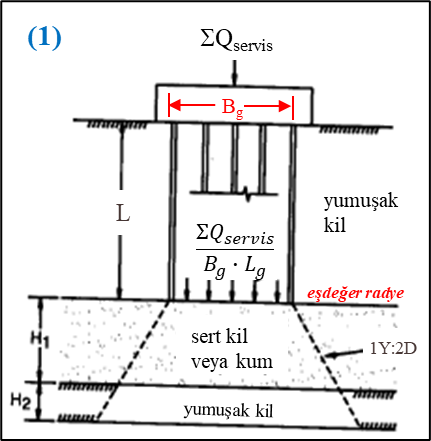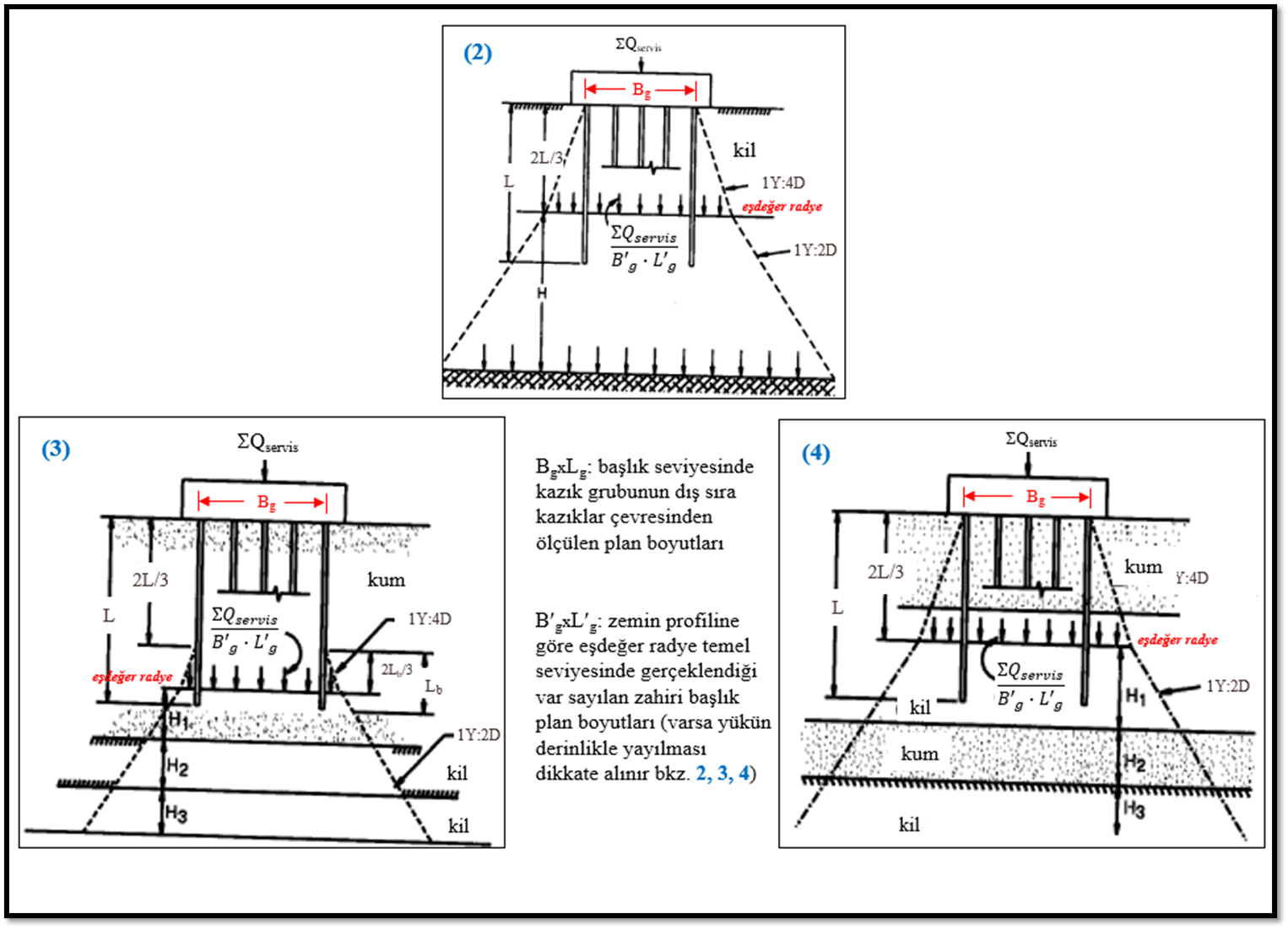 Kazık gruplarının blok halinde oturması eşdeğer radye temel seviyesinden itibaren başlar. Eşdeğer radye temel seviyesi zemin profillerinin çoğunda kazık başlığı tabanından itibaren 2L/3 derinliğinde (L: serbest kazık boyu) olmasına rağmen tabakaların durumuna göre bir kısım farklılıklar arz eder:
