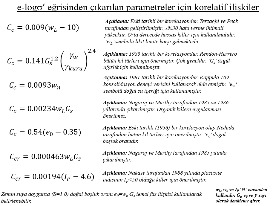 Zemin sıkışma parametrelerini (sıkışma indisi: Cc , tekrar sıkışma indisi: Cr , doğal boşluk oranı: e0 , hacimsel sıkışabilirlik katsayısı: mv , drenajsız deformasyon modülü: Eu , drenajlı deformasyon modülü: E’) yaklaşık olarak sağlayan ilişkiler laboratuvar veriler ve arazi deney verileri başlıkları altında toplanabilir.