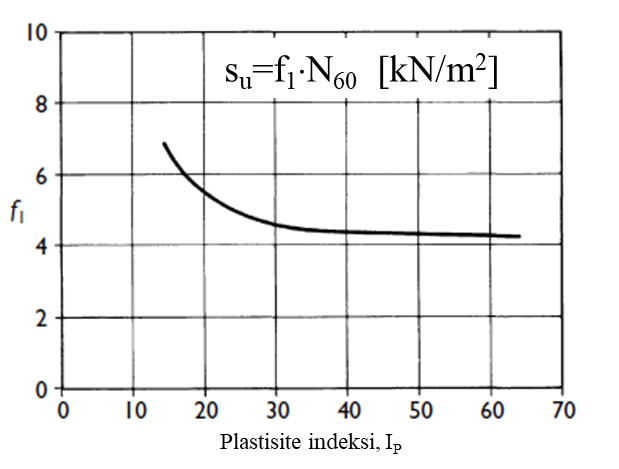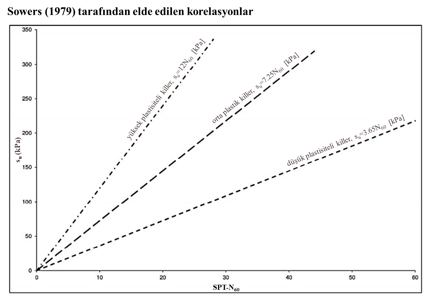 Drenajsız kayma mukavemeti, su, ve arazi SPT değeri, N60 (yalnızca enerji düzeltmesi uygulanmış) arasındaki ilişkiyi değişim aralıkları halinde veren Terzaghi-Peck (1967) korelasyonu, aşağıdaki çizelgede verilmiştir. Bu çizelgenin doğrusal regresyona dökülmüş hali