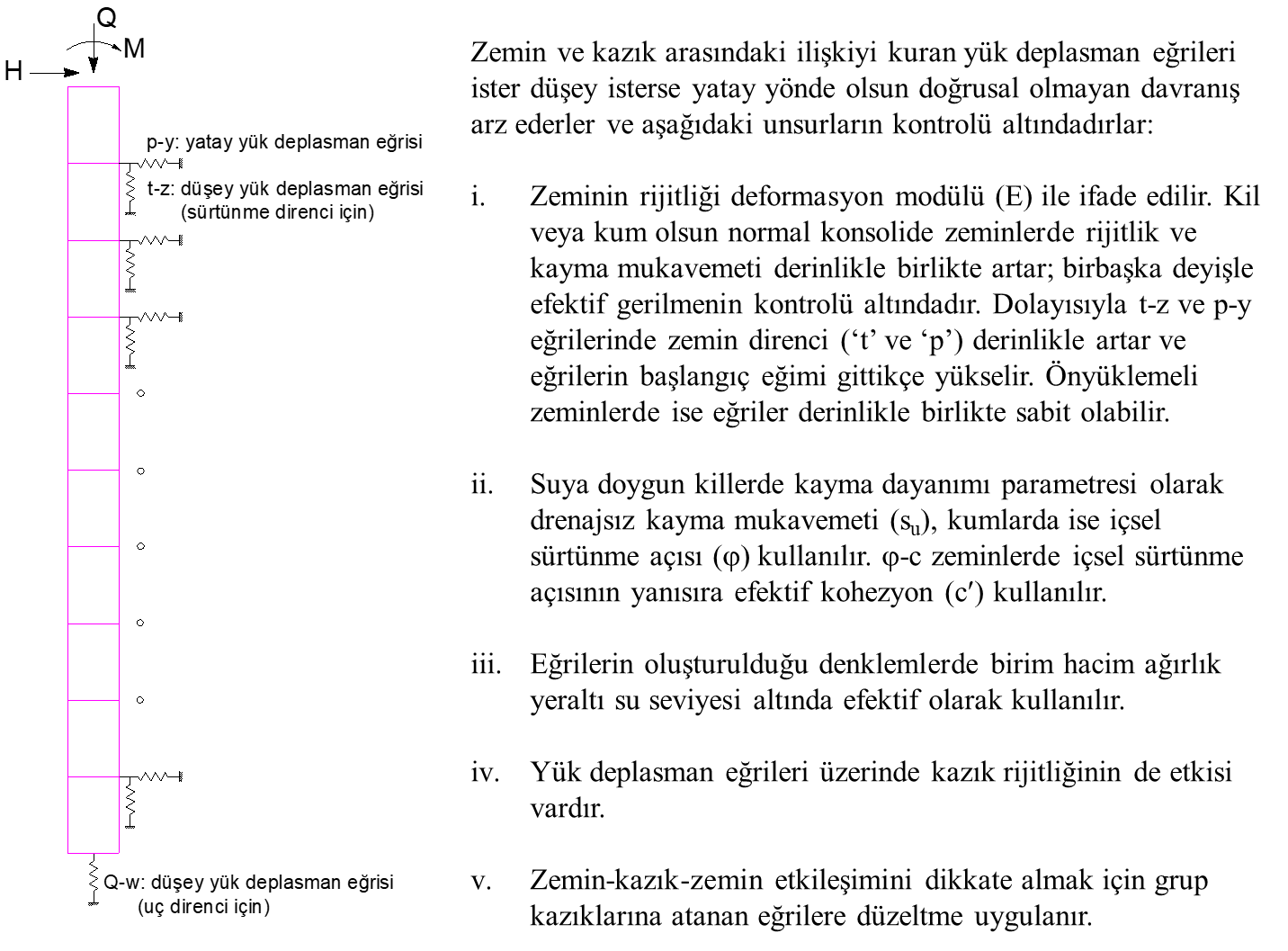 Problemin serbestlik derecesini azaltmanın en kolay yolu zemini modelden kaldırmak ve bunun yerine zemin-kazık ilişkisini kuran yük-deplasman eğrilerini (sürtünme direnci için t-z eğrileri, uç direnci için Q-w eğrisi ve yanal yönde kazığı çevreleyen zeminin desteği için yatay yük deplasman eğrileri olan p-y eğrileri) kullanmaktır.